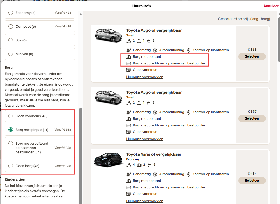 Tip! In boekingstap 1 kun je filteren op verschillende typen borg, zoals borg met pinpas en contante waarborg.